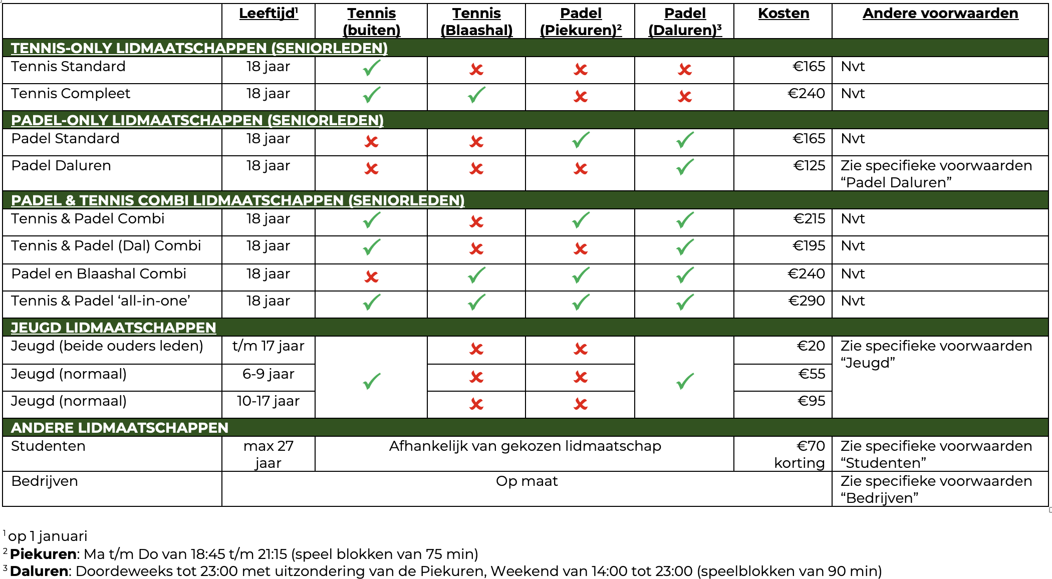 - Padel: leden mogen spelen op alle banen het hele kalenderjaar, behalve wanneer de temperatuur onder de 5 graden onder nul daalt.