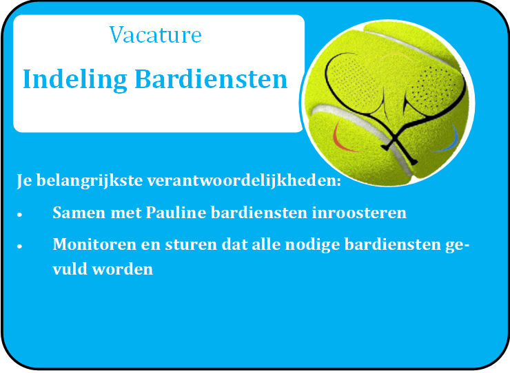 Heb je interesse voor de vacature "Indeling bardiensten", meld je dan bij iemand van het bestuur.