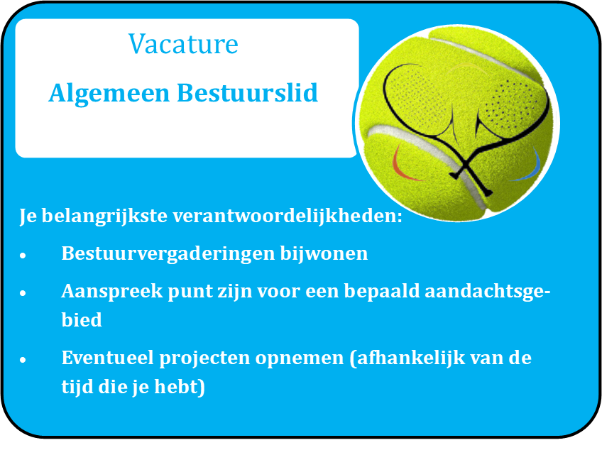 Heb je interesse voor de vacature "Algemeen Bestuurslid", meld je dan bij iemand van het bestuur.